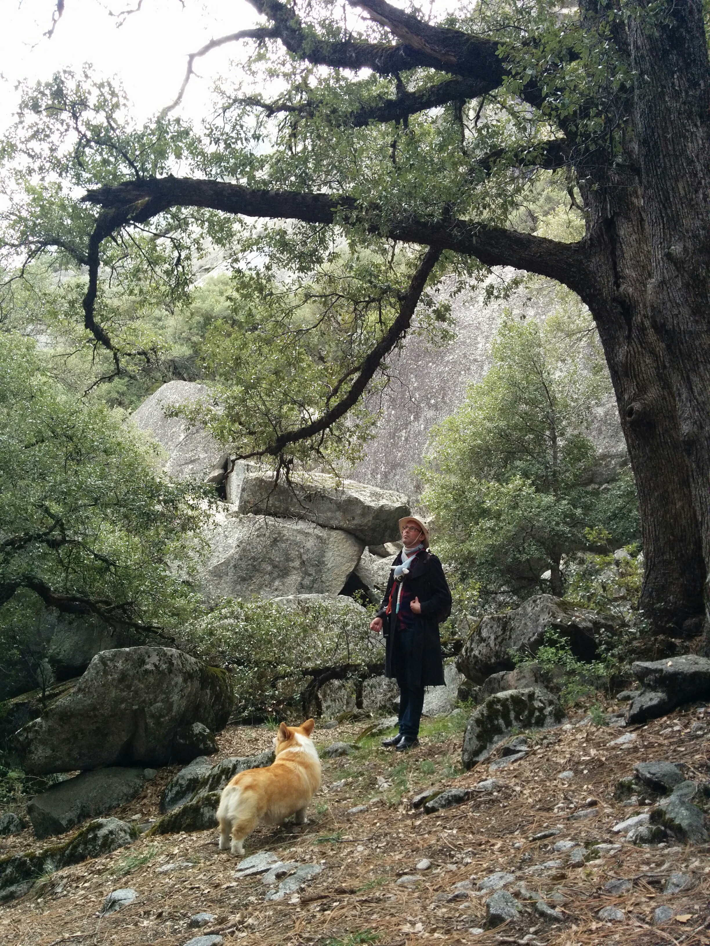 Man, dog, and rocks